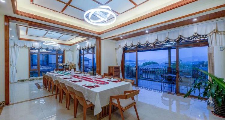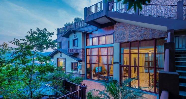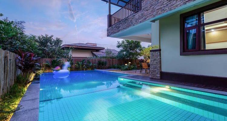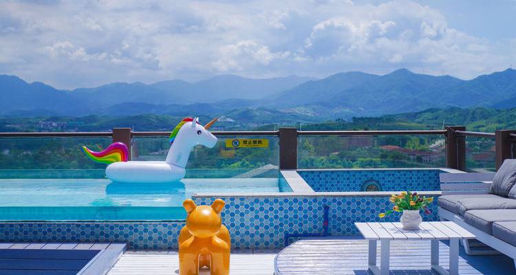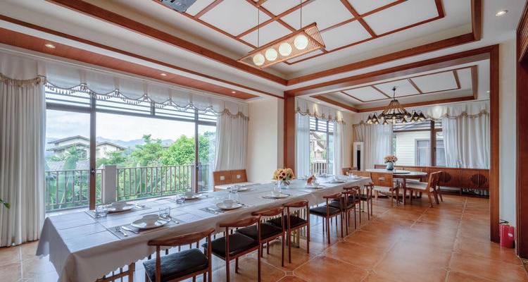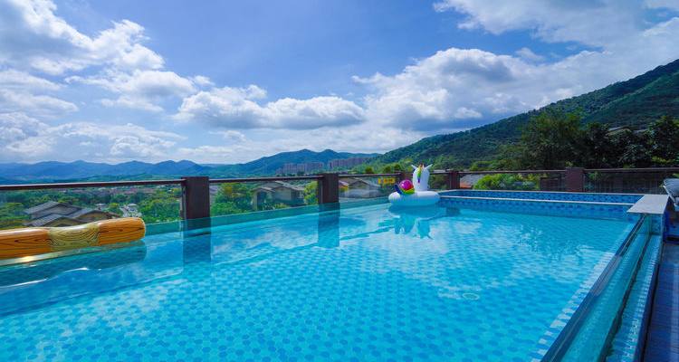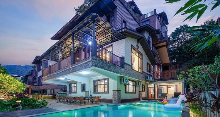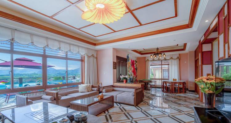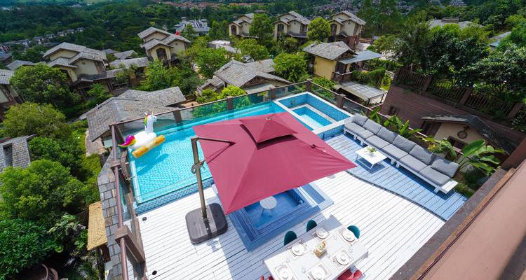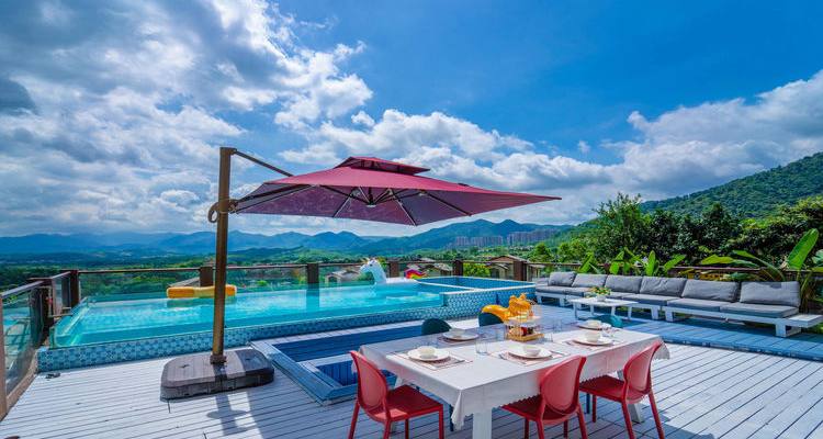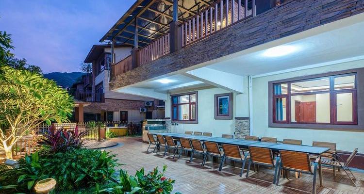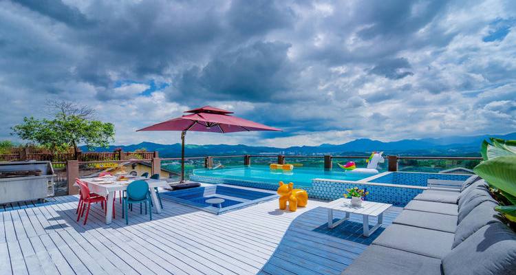 1楼设有烧烤平台,大泳池,室外溫泉池,餐桌烧烤佈置,独立KTV房