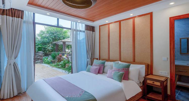 1804号大套房位于别墅1楼 1张1.5米大床+独立洗手间+落地玻璃窗往魚池。
